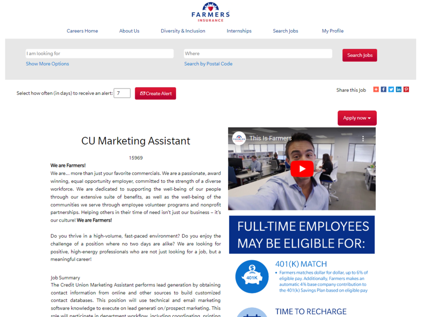 The Farmers Insurance job ad for a marketing assistant role begins by highlighting their culture and benefits. However, they don’t just list facts in a formal tone of voice. Instead, they use friendly and casual wording, such as: “Helping others in their time of need isn’t just our business — it’s our culture!”